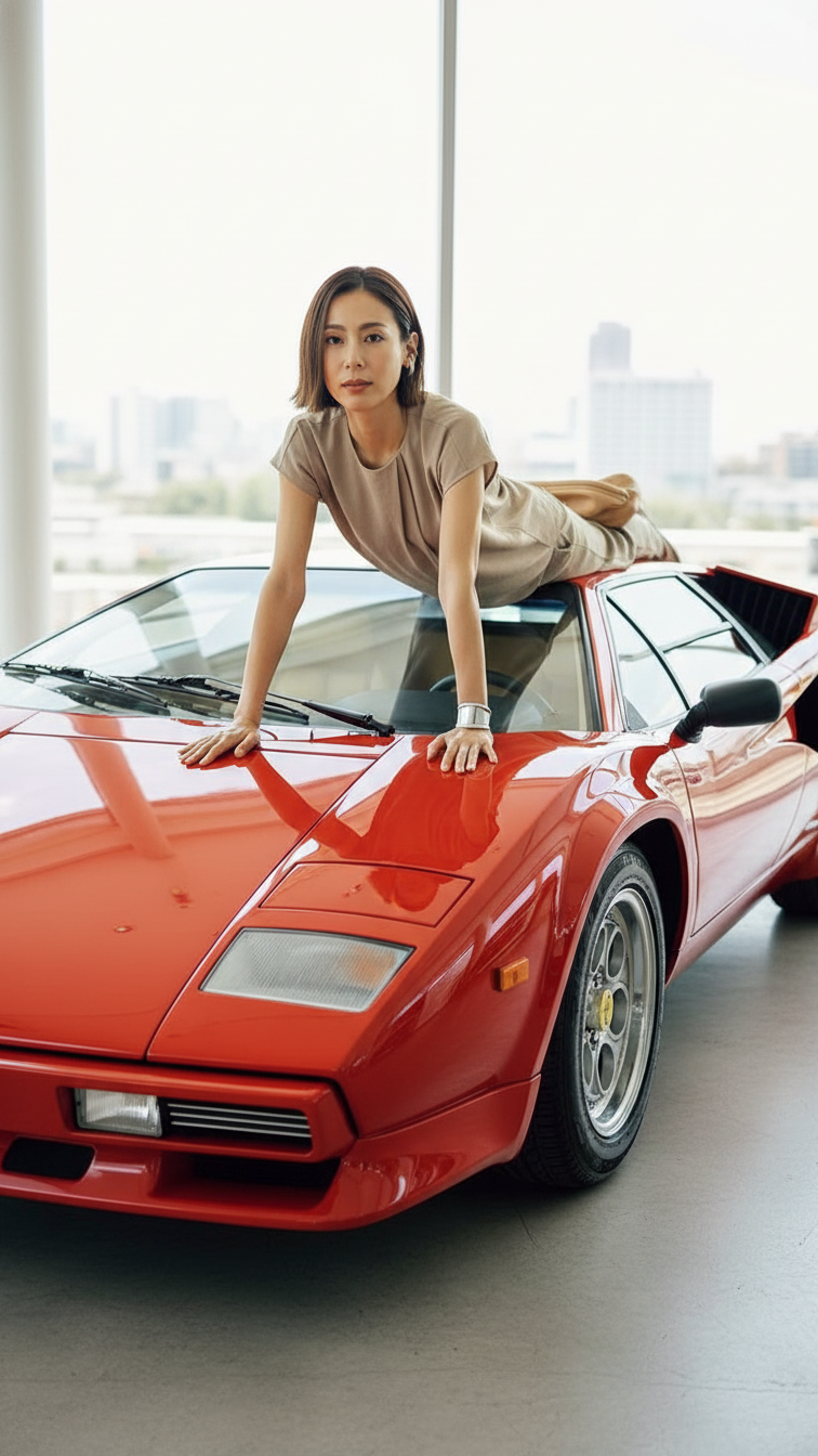 深紅のカウンタックの上で戸惑う美しい「女豹」と、床に崩れ落ちた哀れな店長。この美しい絵面と悲惨な(でも面白い)現実とのギャップが、笑いをさらに増幅させるのです。