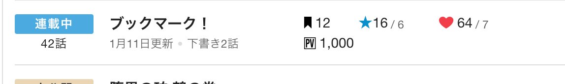 今さっき、たまたま小説の欄のところ見たら、ブックマークのPV数がピッタリ1000になってました!