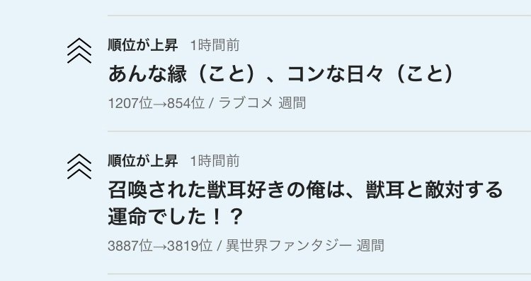 そして此処からはご報告!な、何と!「コン」「ケモケモ」の2作品がどちらもランクアップを果たしていましたぁ!誠にありがとうございます!(´;ω;`)