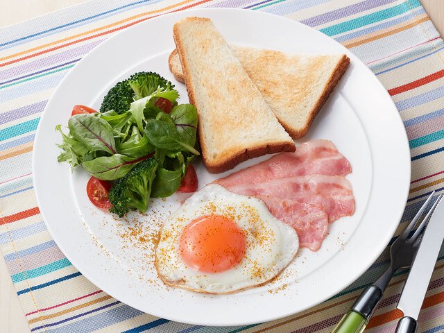 先ず、バターが無い地点で、パンにはベーコンや目玉焼きを挟むことが確定されます。サラダはそのまま食べても、挟んでもよしとして、問題はベーコンと目玉焼き。挟むにしてはパンを台形にカットされていて、ベーコンはともかく目玉焼きは挟みにくい。となれば、ベーコンだけ挟んで(ルッコラ等サラダは任意とする)目玉焼きの黄身にディップして食べるのが正解か。