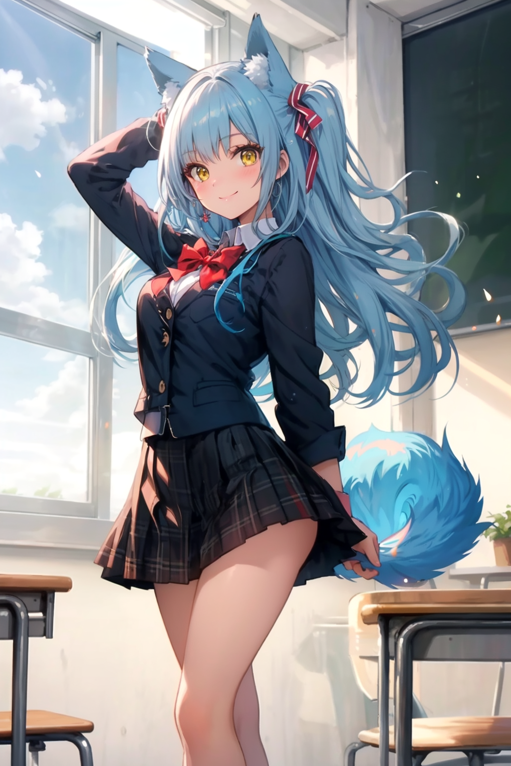 つり目で顔はすごく整っている。身長156センチ、空色の髪でワンサイドアップ(髪の片側だけ結んでる髪型)、目は黄色で縦割れの瞳孔(狐の目)