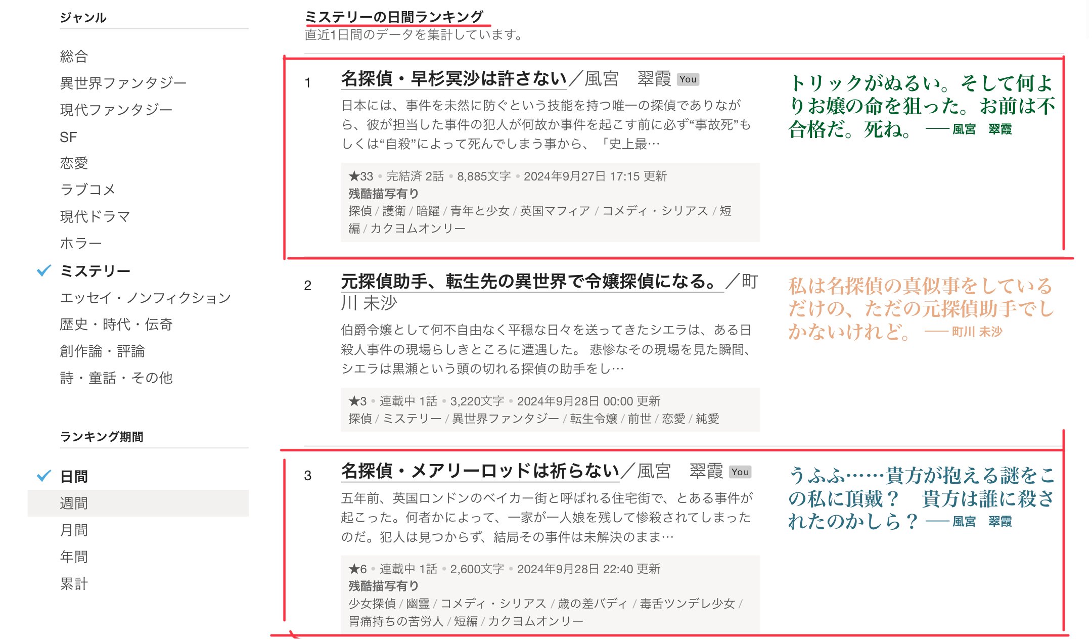 その結果ミステリーの日間ランキングが面白くなっていたので、そっちのスクショを載せます。