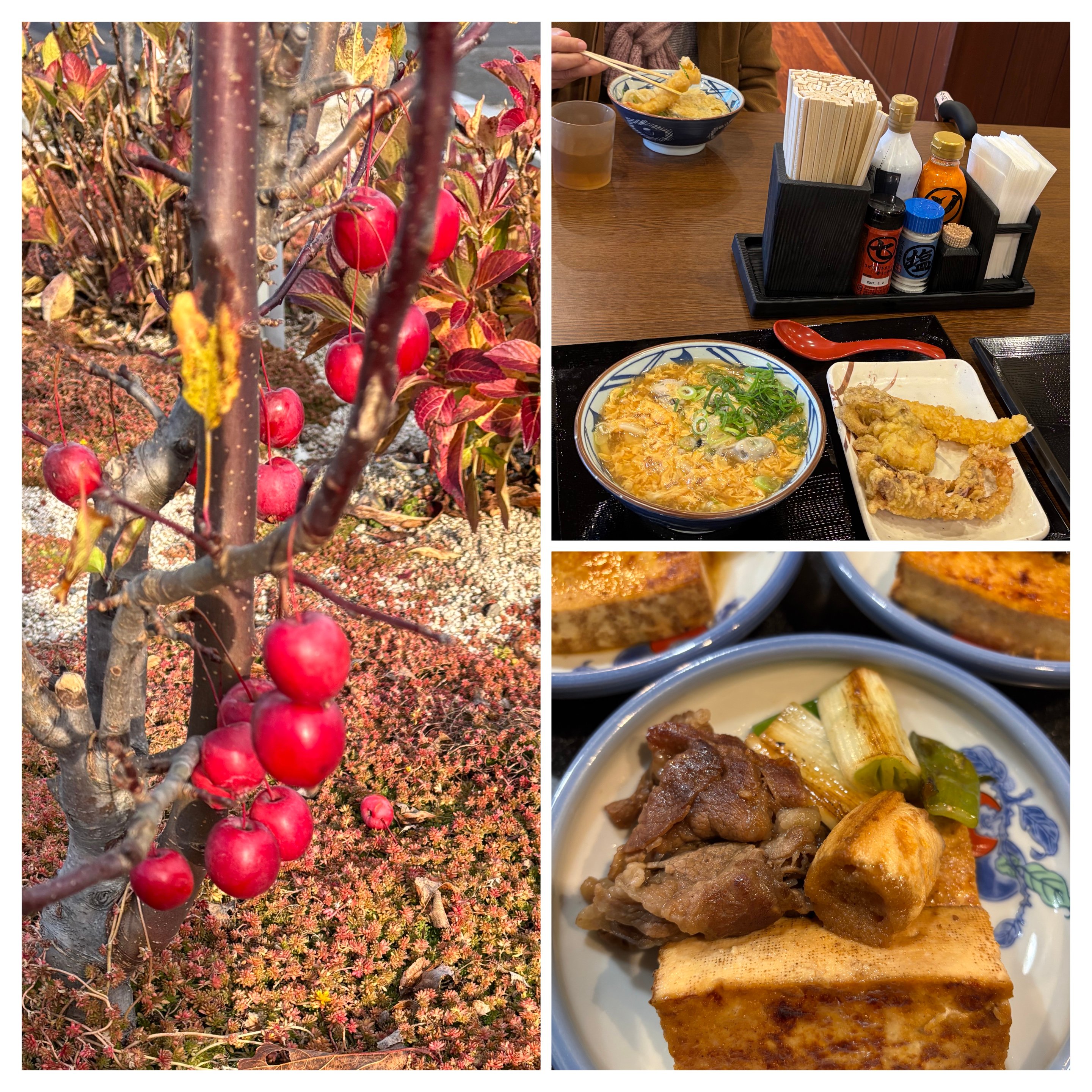かきたまうどんでしょうか、美味しそうですね。ゲソ天?もいい。肉豆腐のネギも美味しそう(´・ω・`)姫リンゴや、イヌリンゴの類でしょうか。可愛いですね♪