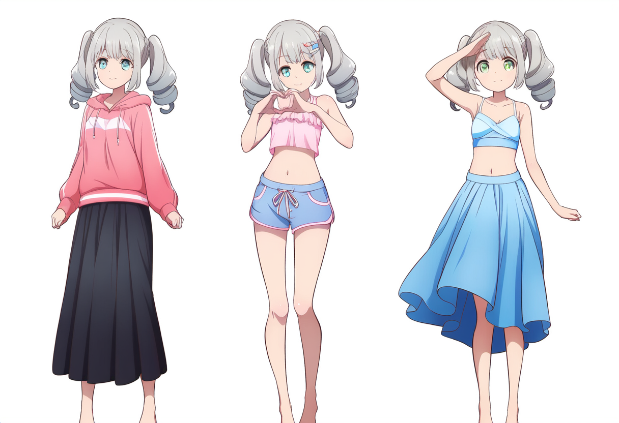 official art,green eyes,silver hair,twin drills, Pink Sweatshirt,Long Skirt,bare feet,flat chest