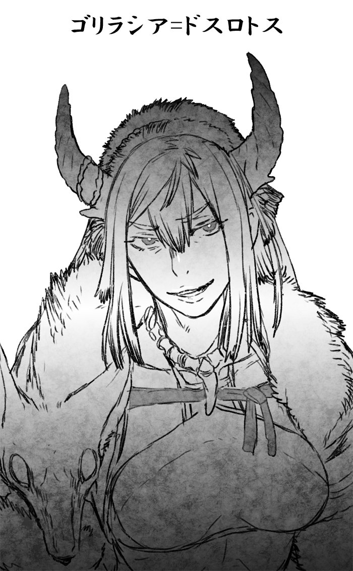 いやぁ~~~何と言っても表情がイイですね!「なぁ~にコッチ見てんだい? 闘ろうってかい?」とでも言いたげな目つき! ってか今気づきましたが炯眼発動してそうだなコレ……服装もドスロトス族(蛮族)って感じでいいですよねぇ~~~! ホネホネアクセサリーに毛皮の襟巻きまでしてるの好き。(輝竜先生いわく「ボーンそうび感」)何気に右角に蛮族リボンみたいなのが巻いてあって蛮族オシャレ!