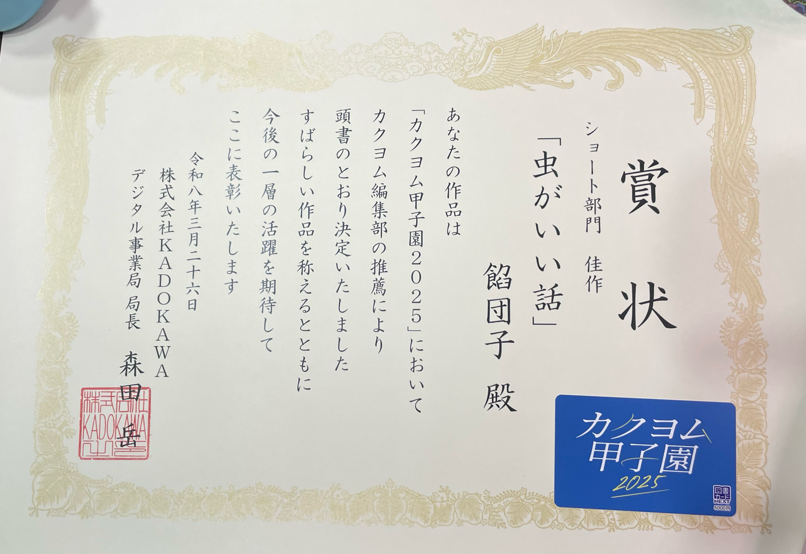 話は変わりますが、カクヨム甲子園の賞状と図書カードが届きました。こちらも様々な方と関わり、助けていただいたおかげです。審査員の先生や、カクヨム運営、読者の皆様、本当にありがとうございます。拙い言葉でしかこの感謝の気持ちを伝えられないのが悔しいです。