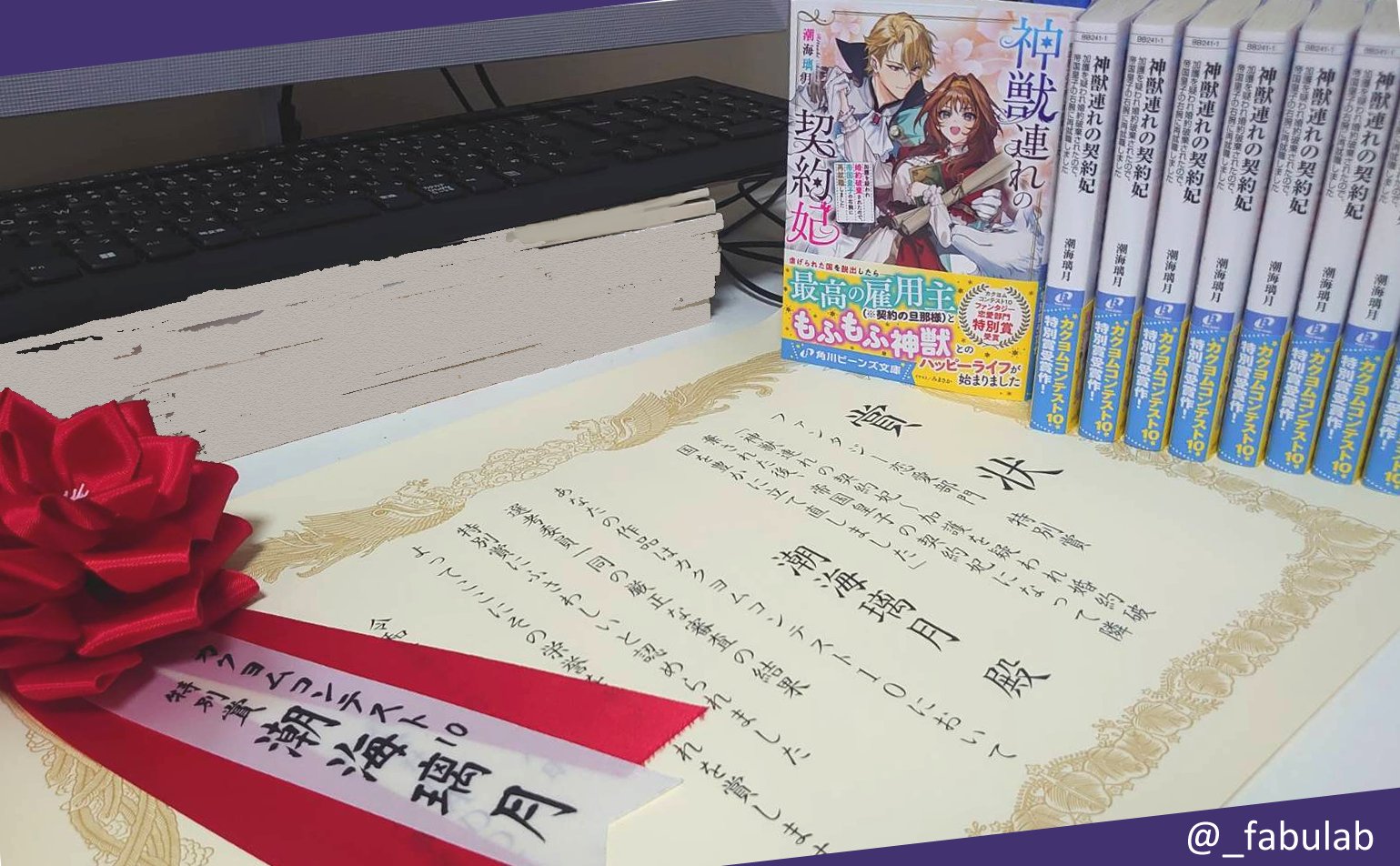 授賞式では賞状と胸の花をいただいたのですが、なかなか写真を載せる機会もないところに、なんと神獣妃の見本誌が届きました! 挿絵もとても素敵なので、私は編集さんに「自分で楽しむだけなのでください!」とお願いしてロック画面に設定するなどして楽しんでおります。みなさんもぜひお手に取っていただき、みまさか先生の素敵な絵を楽しんでください。書籍化にあたりラウレンツのらしさをがっつり前に出せたと思うので、そのあたりも楽しんでいただければ。
