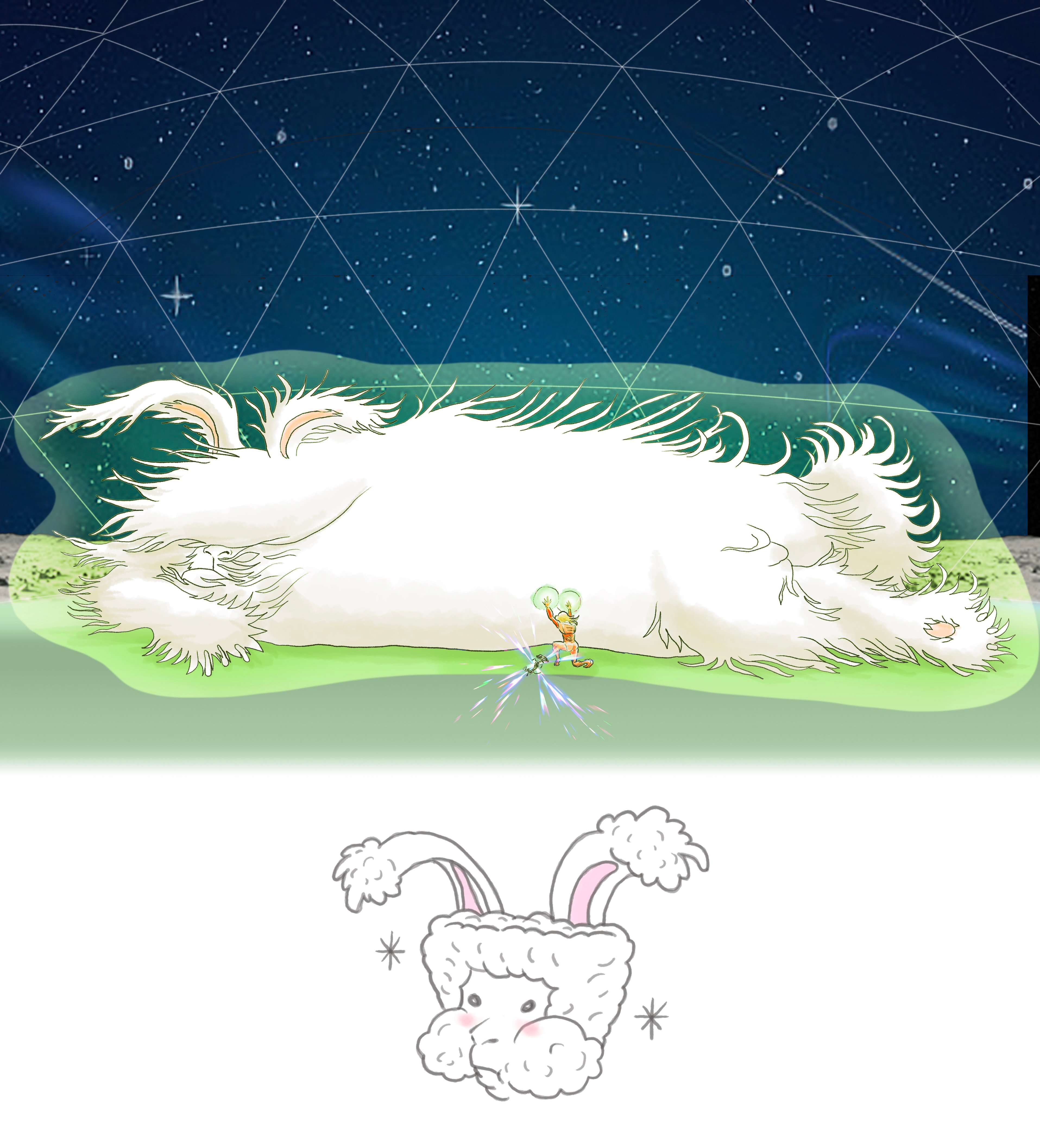 高さ5m長さ30mのジャンボアンゴラウサギが寝そべっていた。足の裏が真っ平らで、息はしてるが全く動かない。