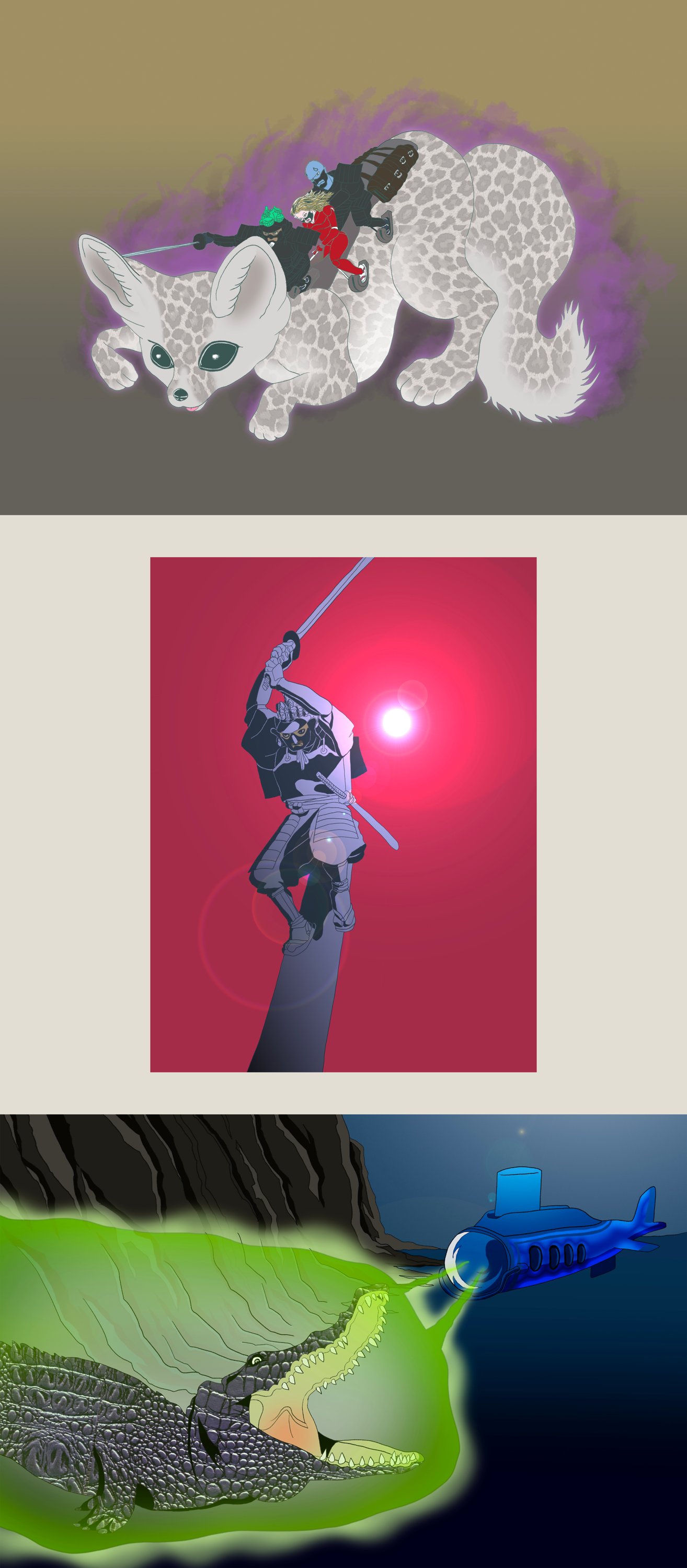 3人はぬえの近くまで徐々に下がった。まごろくは兜の緒を引くと、ホログラムの狛犬が3頭浜辺に現れた。