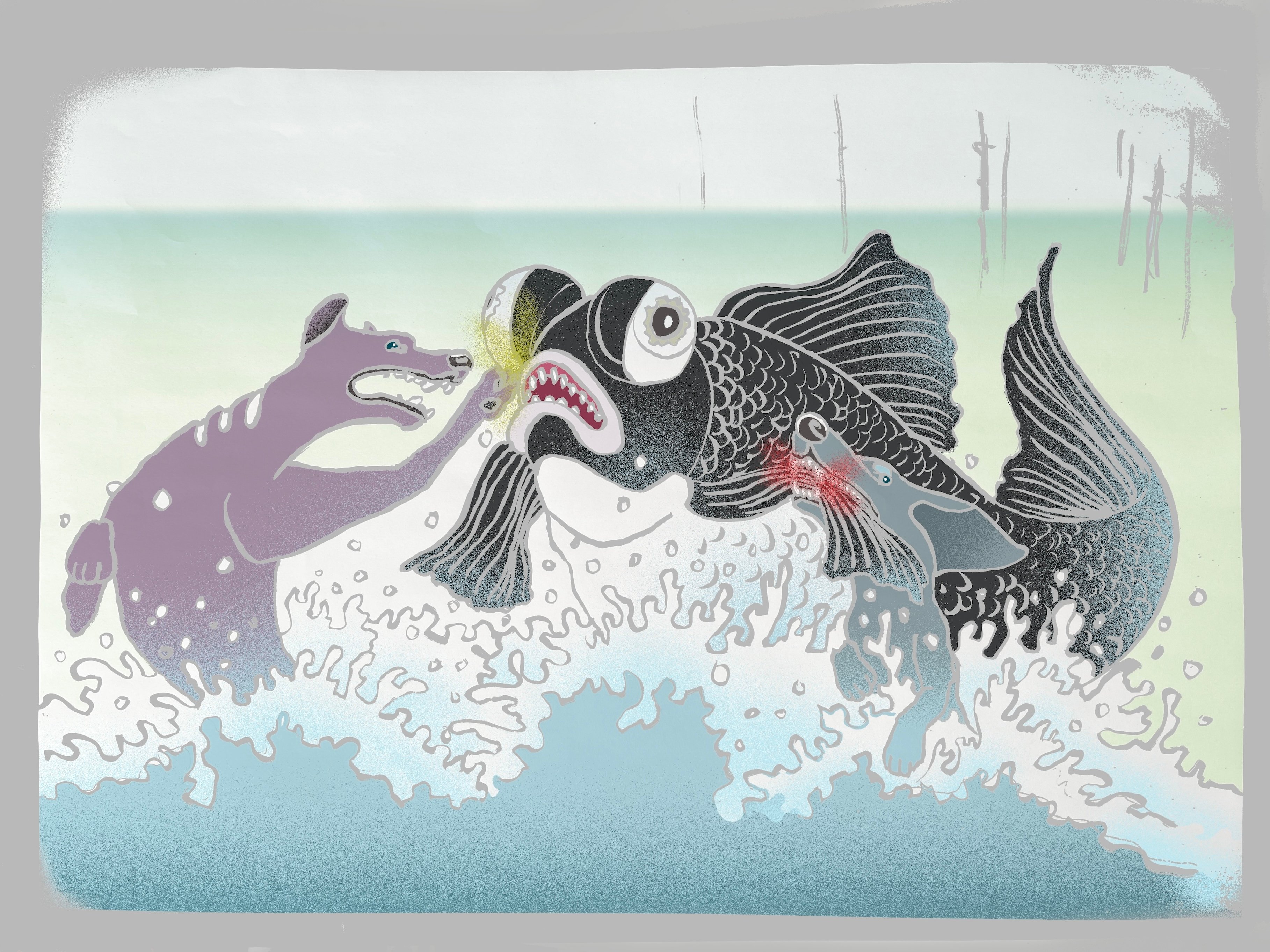 チョコは身をよじり抜け出そうと泳ぐ。ゴーストが出目金の頭を両前足で突き飛ばし、エラの所にガブリと噛み付いた。出目金はバシャバシャ暴れ、チョコは抜け出し、岸に向かって泳いでいった。