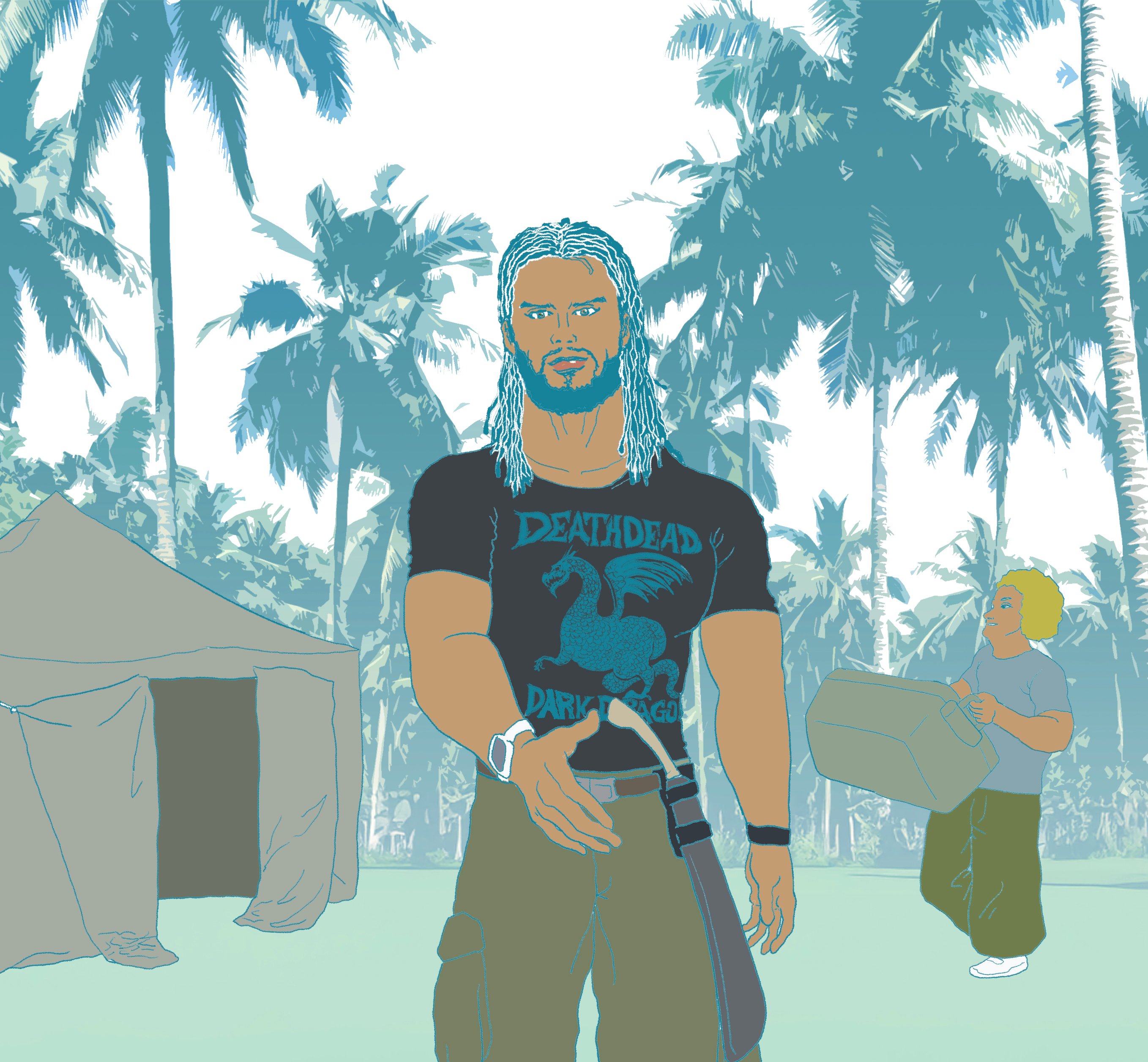 「やあ、団長のミゲルだ。ラフの知り合いか?皆、若いな。」ブラウンの肌、ドレッドヘアー、髭をたくわえ、筋肉質な体にバンドTシャツ、腰にナタを下げたミゲルは団長の風格がある。