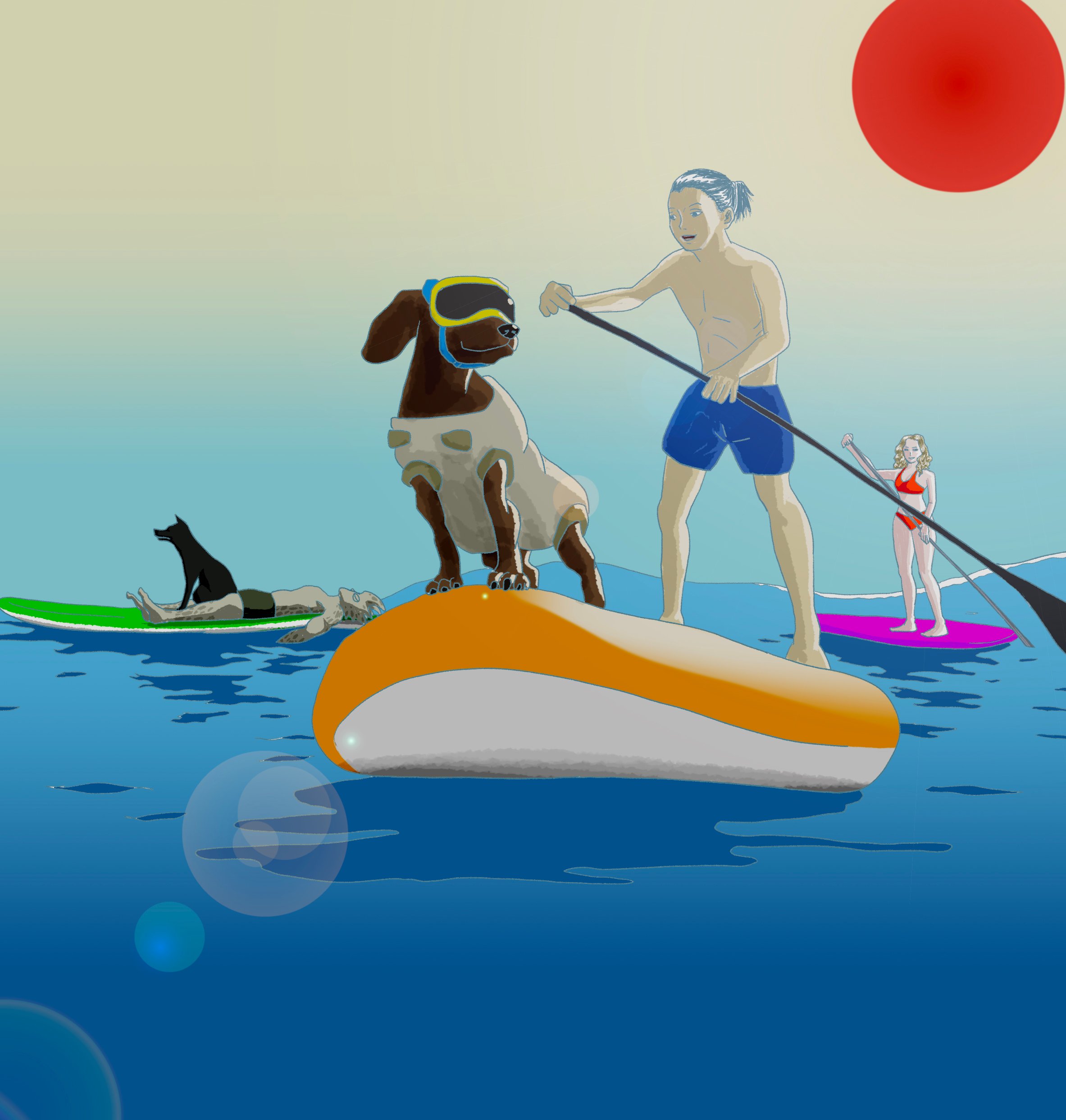 犬達も一緒にサップボードに乗り、湖に漕ぎ出した。