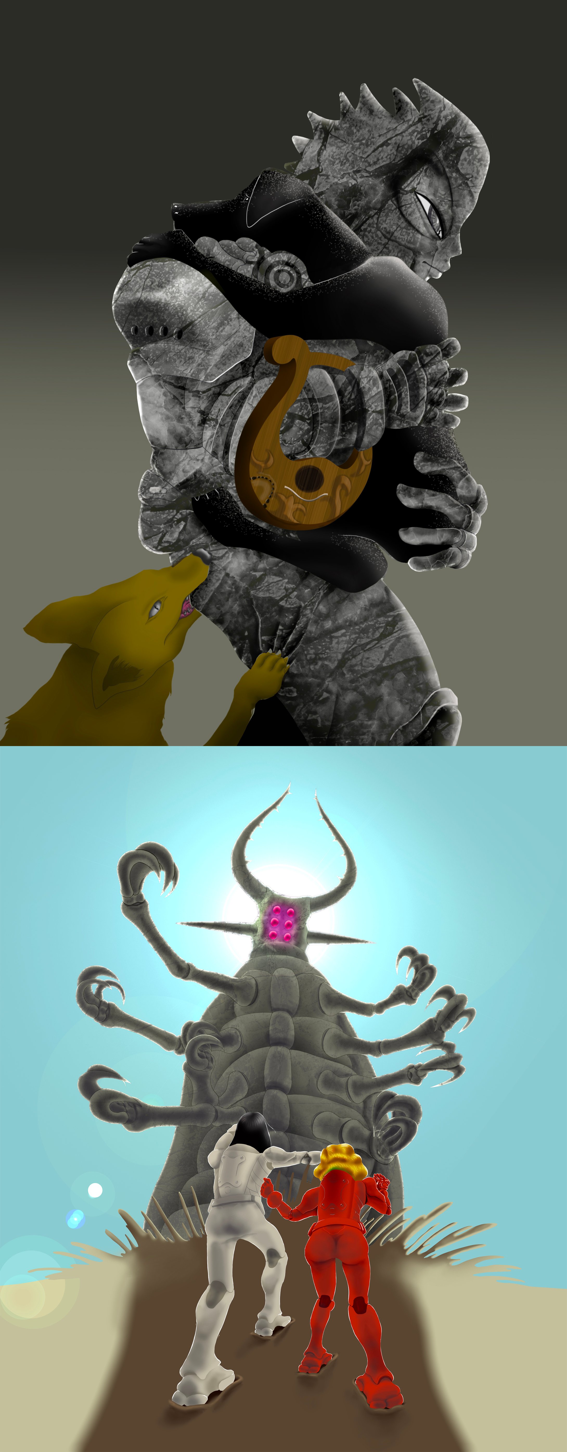 「あった。フリーズ!」スノーはゴーストのパワーを使った。狼達はスローモーションになり、身動きが取れない。スノーは狼の間をよけて竪琴を拾い上げた。スノーの体の硬化は時間切れとなり、岩や土がボトボト落ち始めた。