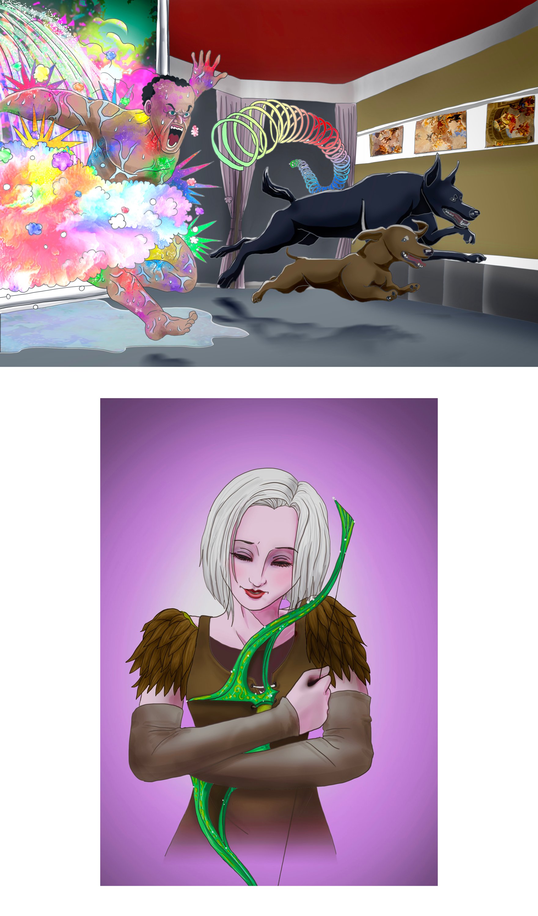 ヌムはカラフルポップコーンまみれで、ベッドの下の棚を勢いよく引いた。「ギャー!ダハー!爪が、、ハア、どうなってる。コノヤロー!」犬達が武器棚をカミハタの実の接着剤で固めていた。