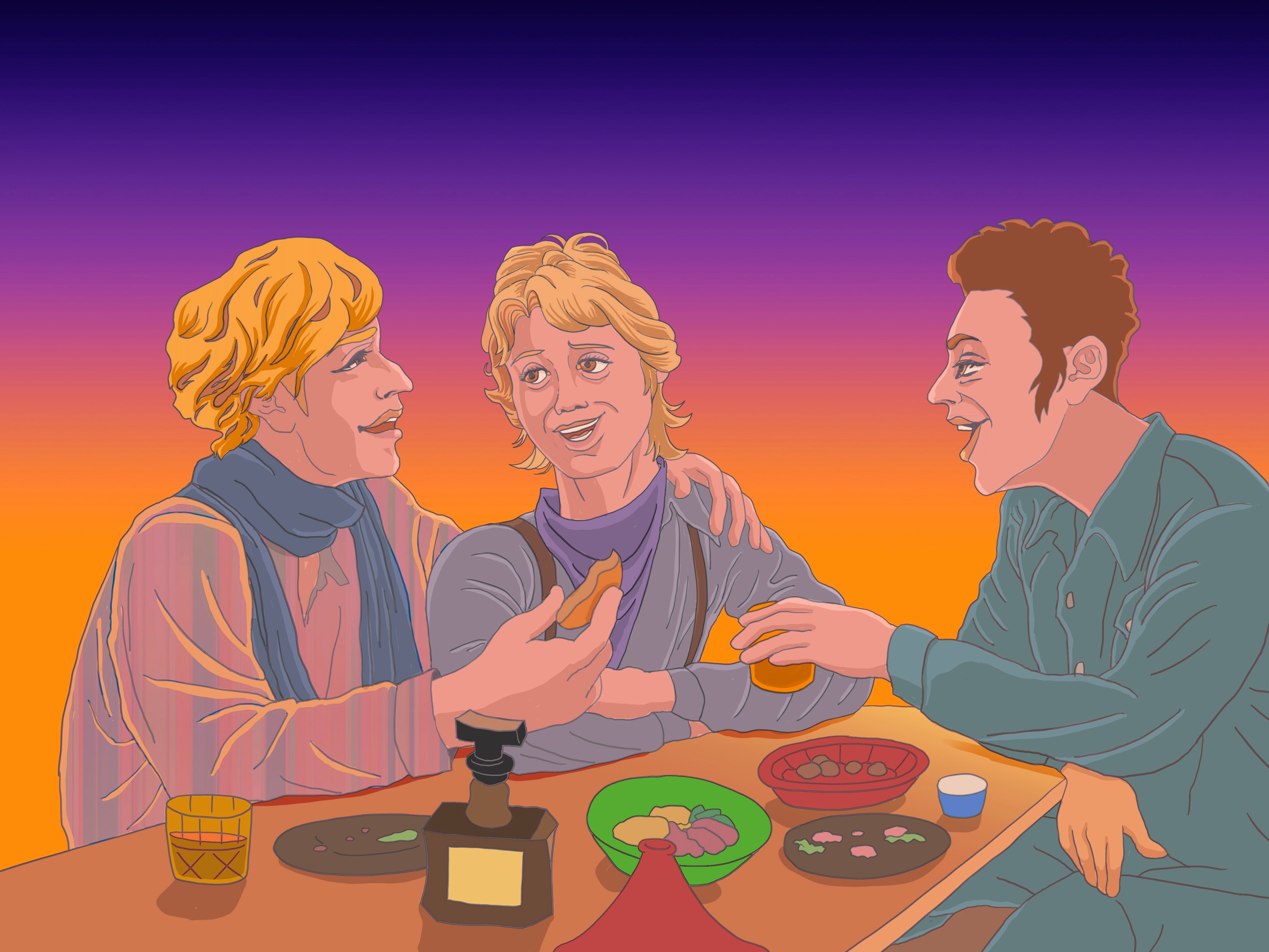 「こいつとんでもない奴だから。」オースティンは大口で玉ねぎとスープをほおばった。「うめ〜。」