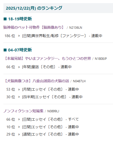 童話やエッセイは、毎日更新していれば割とあっさりランクインします。