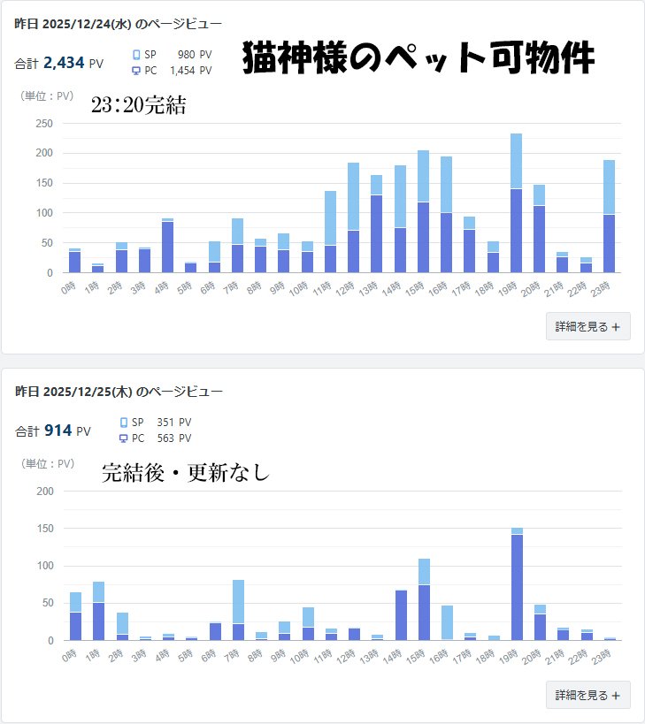 12/24の23:20に完結した小説、翌日についた914PVは新規さんではなくリピーターさんたちの足跡と思われます。