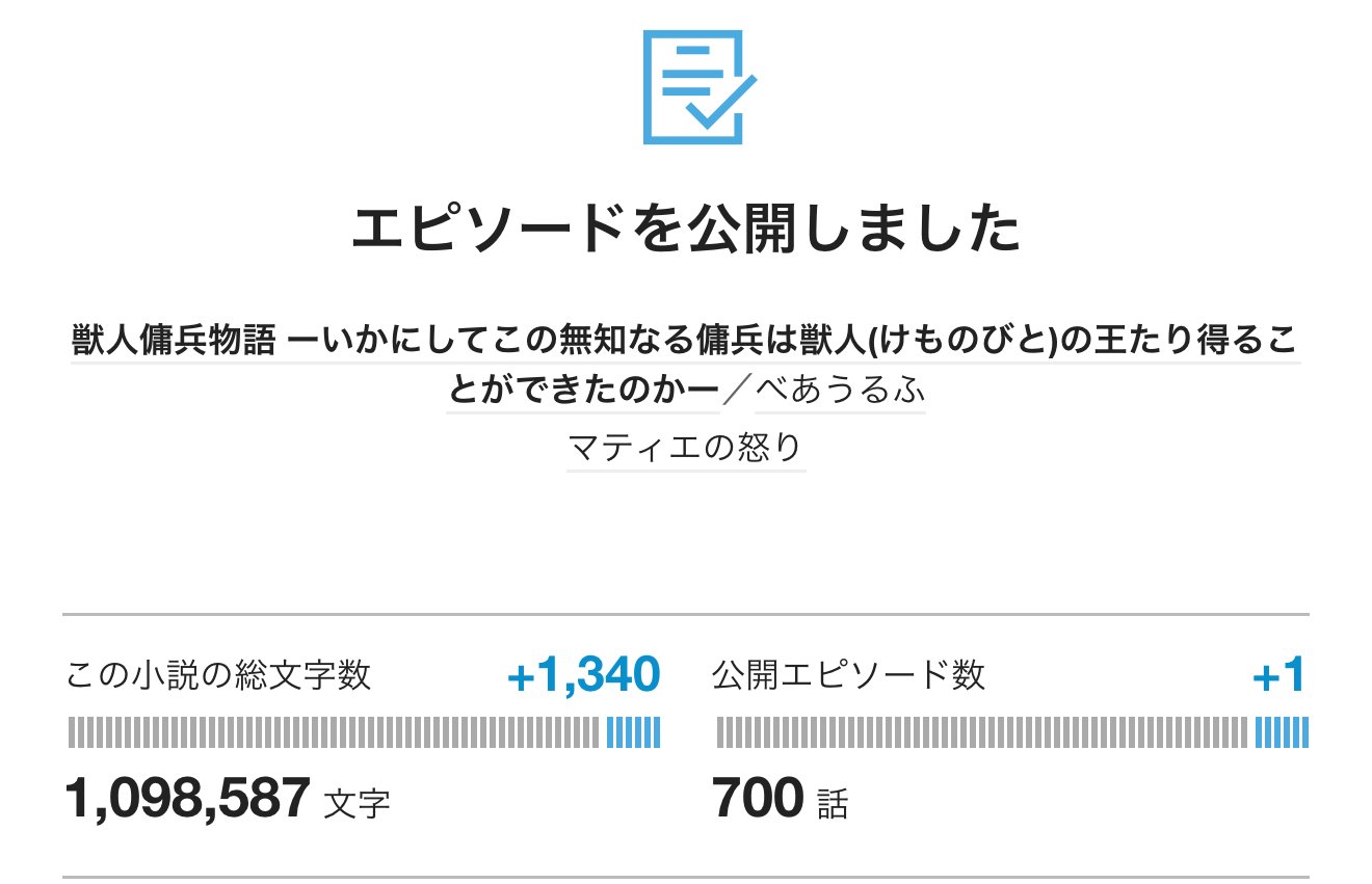 なろう版と比べていろいろ統廃合したり細かな部分で違ってる獣人傭兵ですが、今日の更新をもって無事700話となりました。