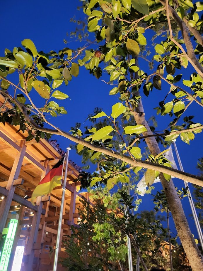 写真はドイツの待ち時間に撮った日暮れ時です。大屋根リング上は花火を待つ人達。