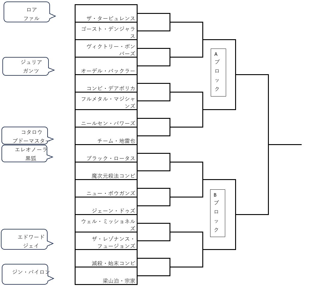 本編の文章だけでは伝わりにくいトーナメント表を公開します。添付の画像をご覧下さい。作成に手こずり、公開が遅れてしまいました。申し訳ありません。