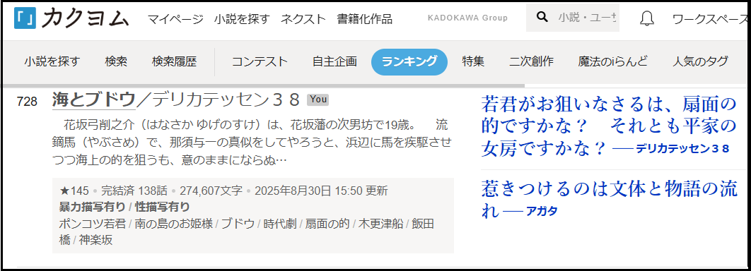 https://kakuyomu.jp/works/16818093078050842013が、週刊ランキング恋愛ジャンル1000番外から、大きく順位を上げて 728位にまで返り咲いておりました。