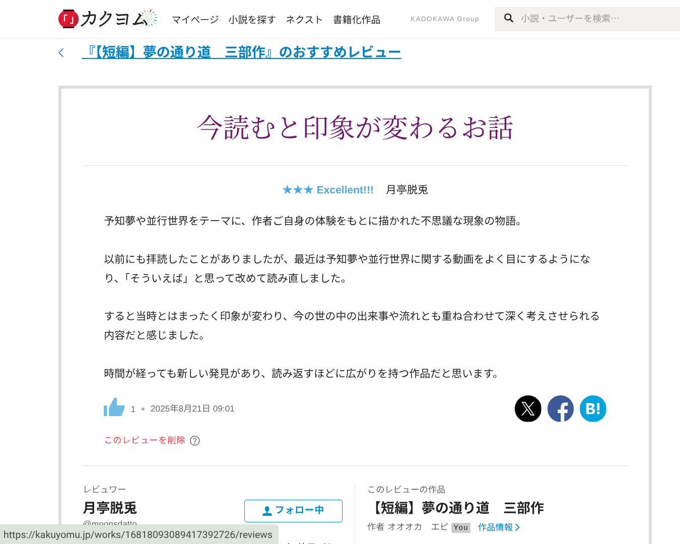 『夢の通り道三部作』に☆とレビューをいただきました。