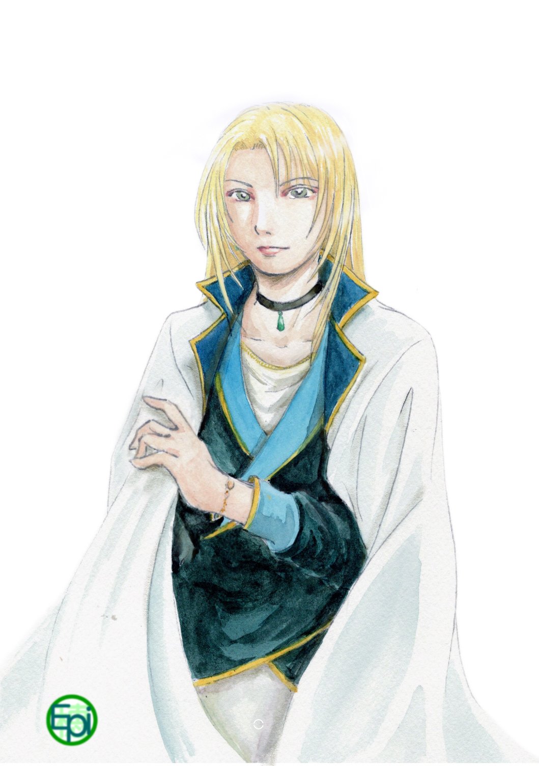アトラスと並んでい方の青い衣装はレクスから渡されたものでAランク。アトラスに仕立ててもらった? 十四・五章「色変わりの護石」水色の旅装もAランク。