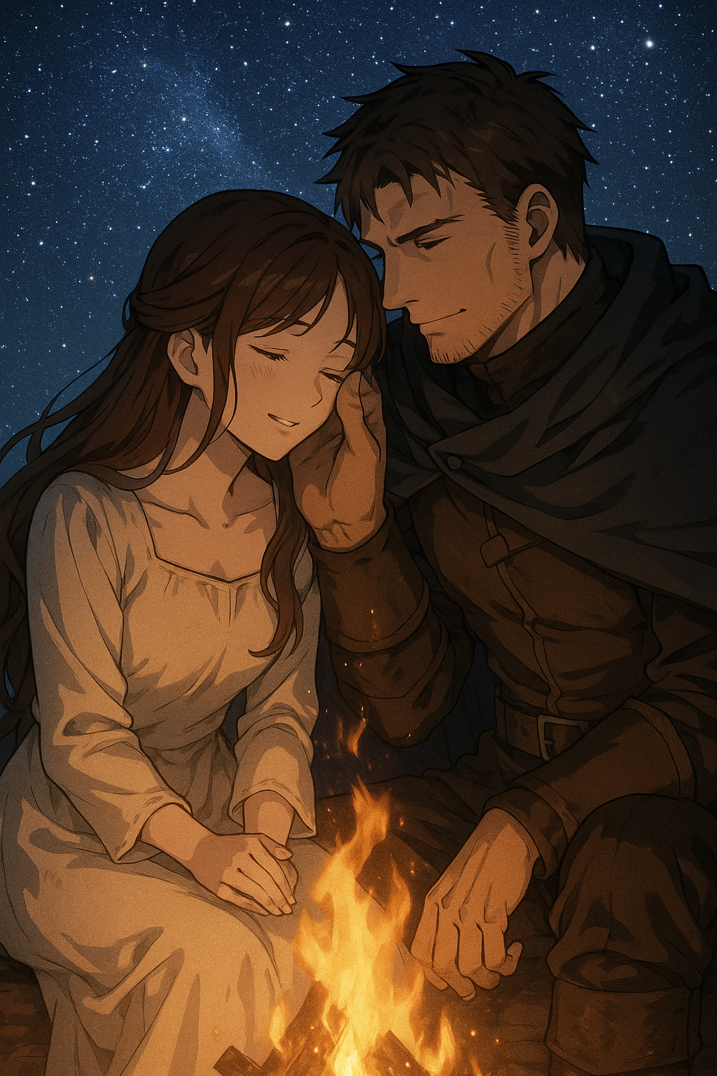 夜空の星々の下、焚き火を挟んで交わす決意と、