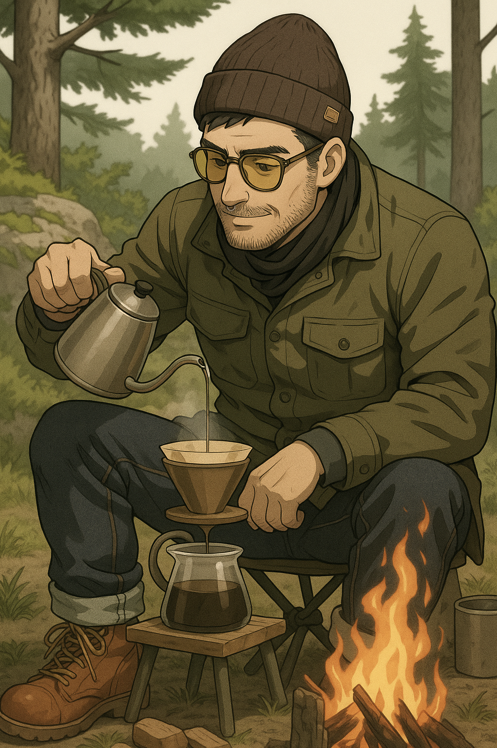 👉⛺️ キャンプ場でコーヒーを淹れてくつろぐ香井 真人(かい まさと)
