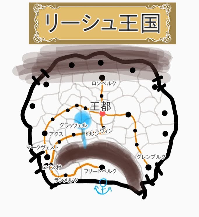 舞台はリーシュ王国(まだ名前は出てなかったかな?)。赤丸が王城、黒丸が領都、茶色の線が東西南北の街道です。焦げ茶色は山脈、名前が書かれてませんが下にあるのがドラッヘ山脈。