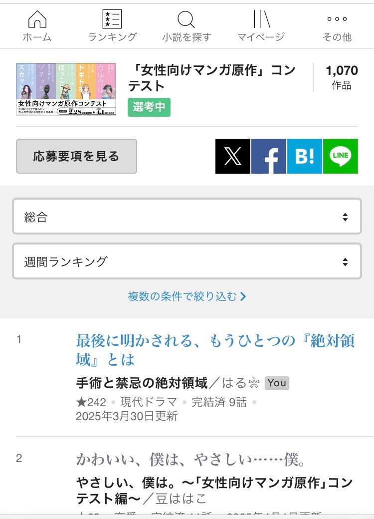 先日教えていただいたのですが、今回「女性向け漫画原作」コンテストの方に応募させて頂いていた短編小説が最後まで総合1位だったようで、本当にこれはお読みくださる皆様のおかげだなぁと、心から感謝の気持ちで一杯です❀
