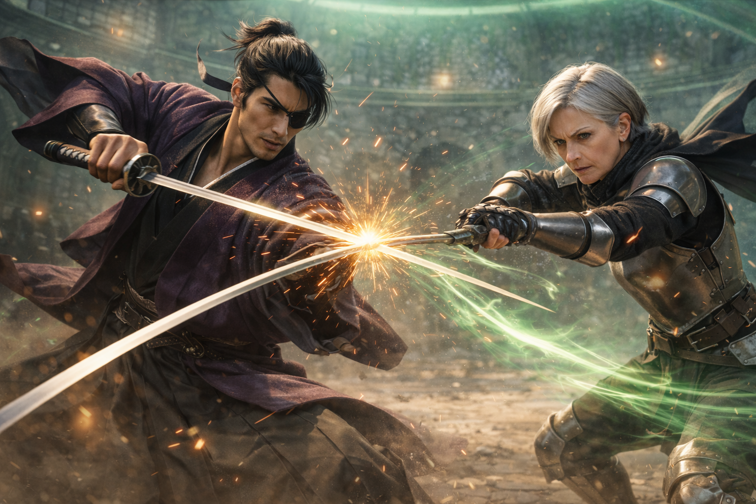 ステラの愛剣、しなやかな直剣「風切り」の変幻自在な軌道に対し、小次郎の愛刀「備前長船長光」はどう応じるのか。