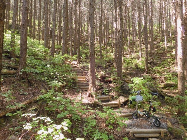 ⑨たまたま通りかかった登山口の看板「山頂まで30分→」を見かけ、自転車抱えたままで登山チャレンジし、バテバテで登頂