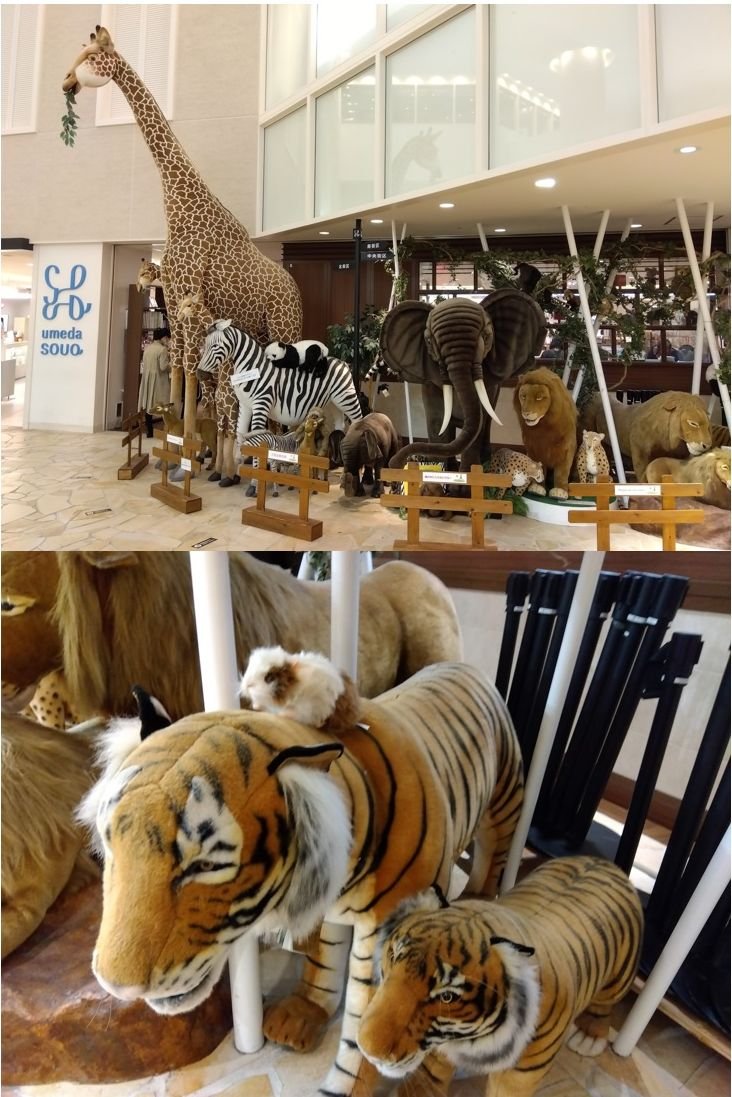 大阪・梅田にある阪急百貨店の一角に、実物大の動物たちのぬいぐるみが、まるで動物園のごとく展示されていました。