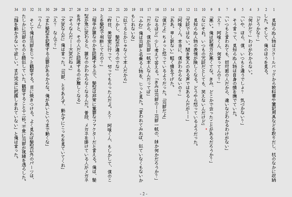 本当はもう1作出したい。実は傀儡のマトリョーシカの続編が9割くらい完成しているのですが、うーん、なかなかね……。タイトルだけ書いておくと、「生者の涙、屍の微笑 Scapegoat」で、失踪したハーモニーの行方を文芸部のメンバーが追うという話です。書いている証拠に画像を添付しておこう。
