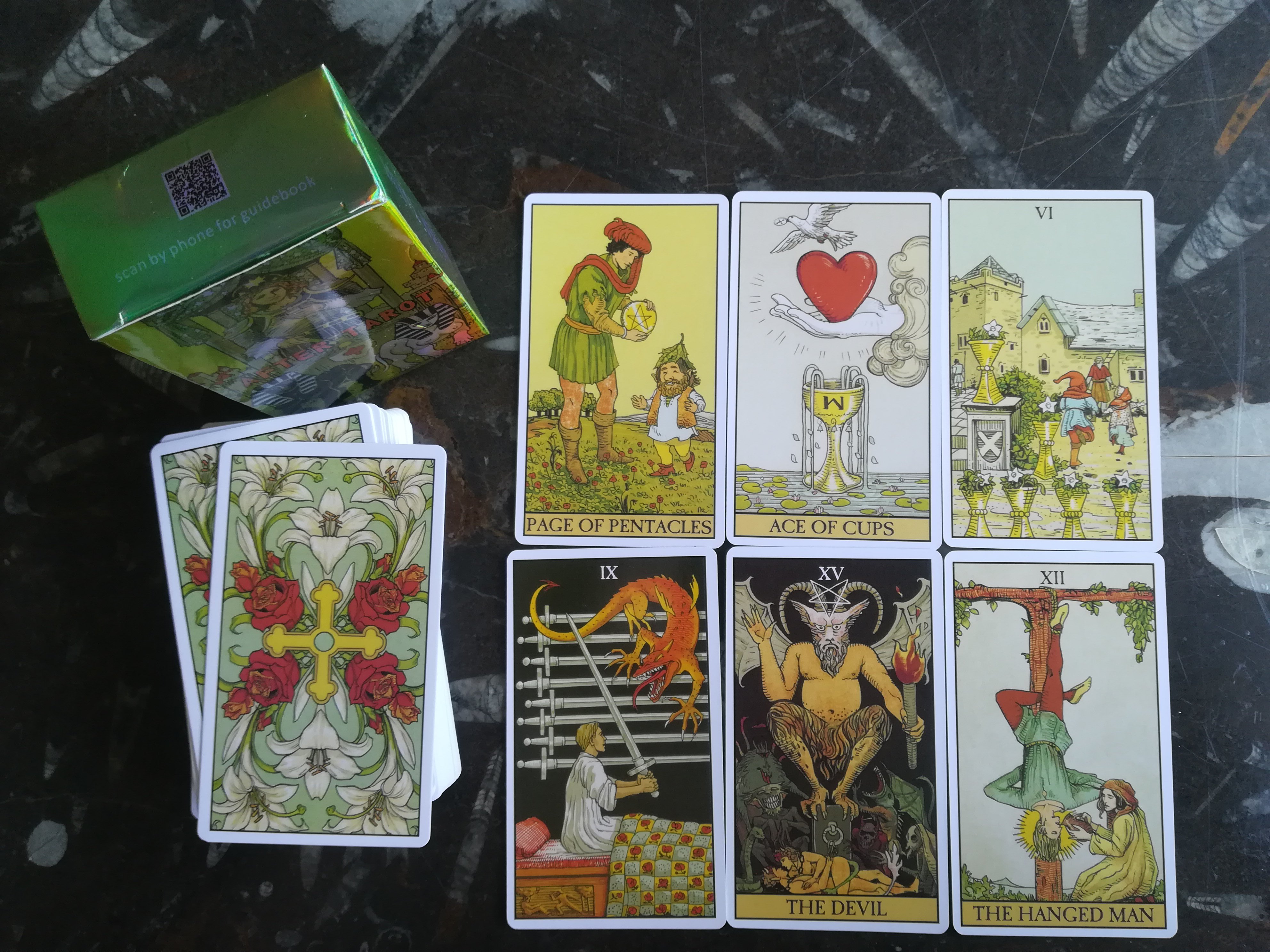 画像はアフタータロット。もともとライダーウェイトのタロットが好きなのですが、各場面の直後を描いた「アフタータロット」なるものがあると知って衝動買いしてしまいました。イタリアのロ・スカラベオ社。絵はジュリア・マッサリアさん。イラストレーターで漫画も描いてるらしい。いいわー、この人の絵。好みだわー。