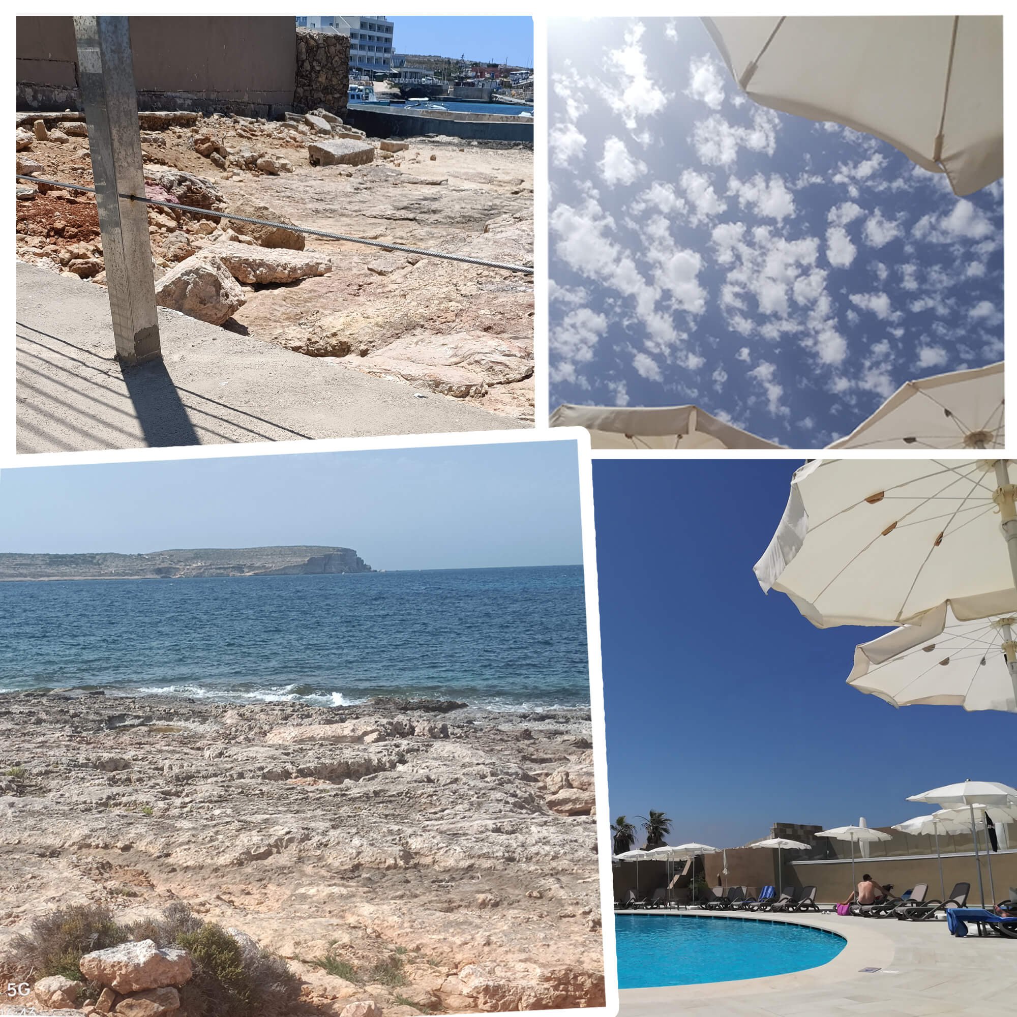 左下の写真で向こうに見える島がコミノ島です。左上は改装中の区画の柵と鉄線。プールもこの柵に囲まれていました。刑務所っぽい? 確かに。