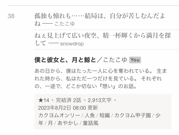 https://kakuyomu.jp/works/16817330660876882510なんと、部門別の週間順位が38位になりました!あ、ちなみに詩、童話、その他です。