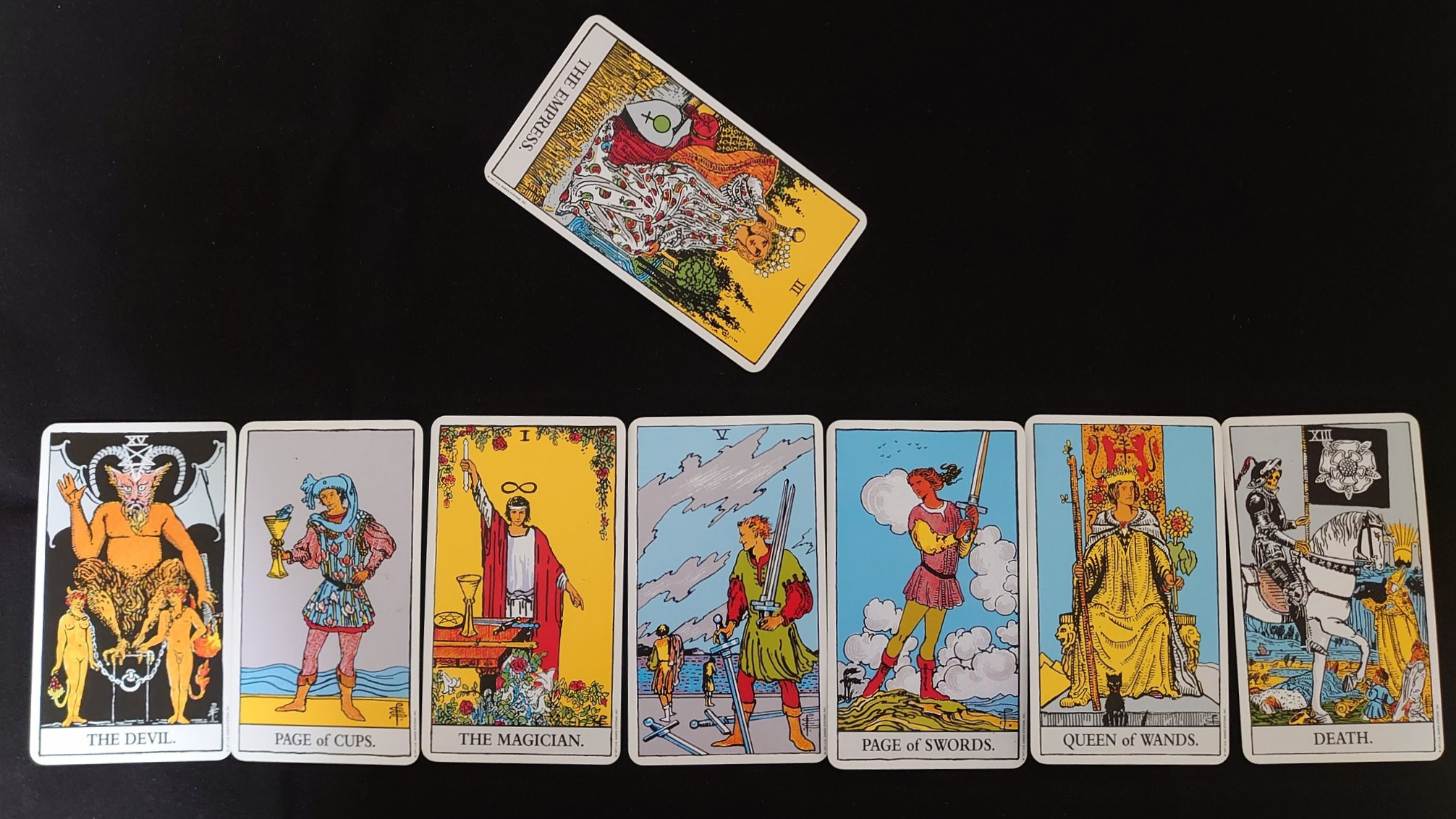 全部で七枚、あ、もう一枚手元からカードが落ちました。女帝、逆位置ですね。これを合わせて全部で八枚。