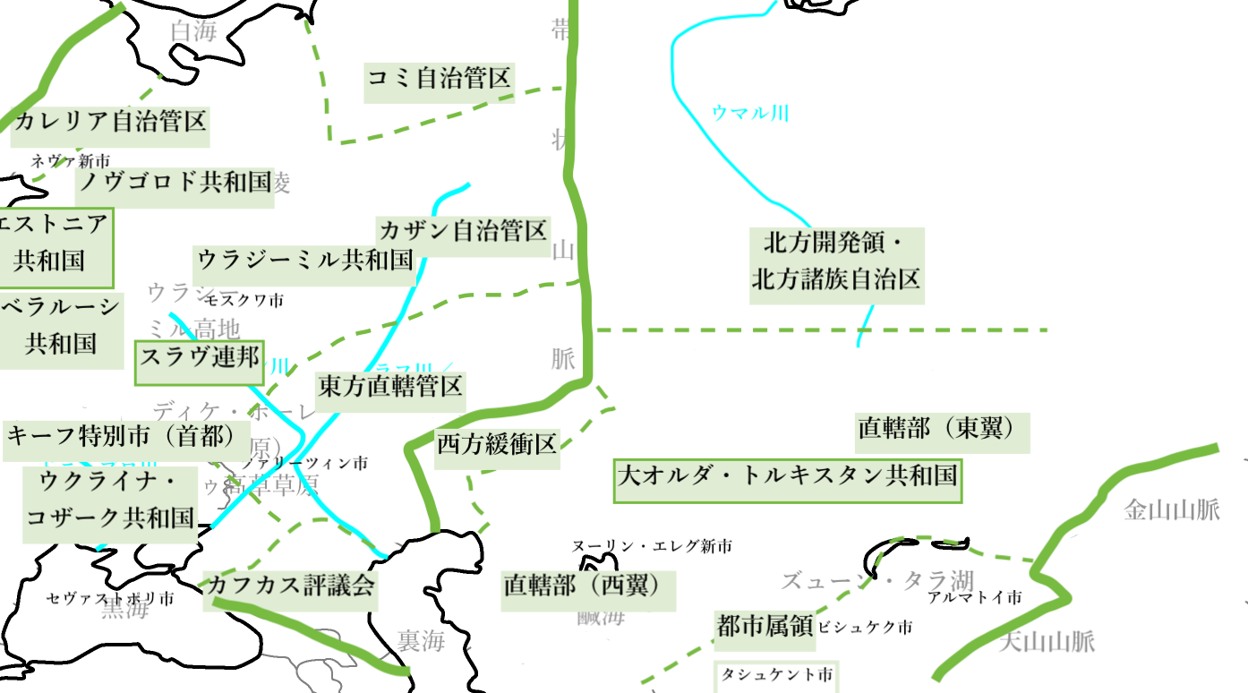 スラヴ連邦、大オルダ・トルキスタン共和国の地図(2095年)