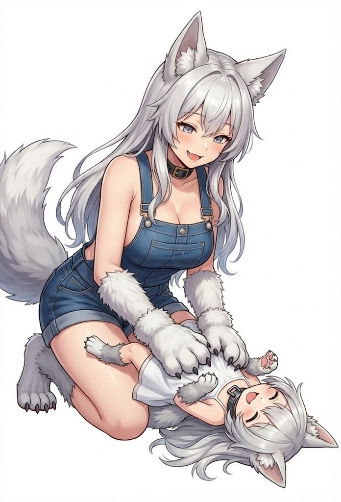 銀狼娘の「フェン」が妹の「ミナ」のお腹を撫でてるシーンですねー。ありがとう、AI。なんていいシーンなんだ。