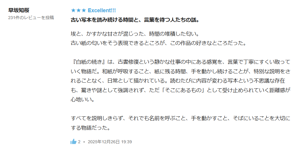 「時間の堆積した匂い」という表現を拾い上げていただけたこと、とても嬉しく思います。古書修復という営みの中にある、静かで地道な時間の流れを、どうすれば言葉にできるだろうかと考えながら書いていました。