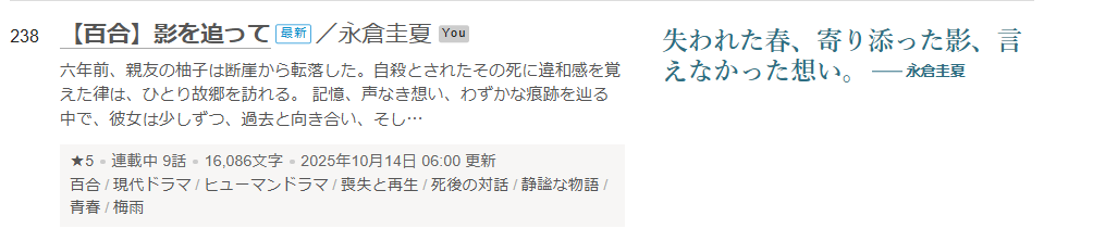 今回は肩の力を抜いてごく自然に書けたので、それが良かったのだと思います。お陰さまで順位も“238位/現代ドラマ 週間”となりました。