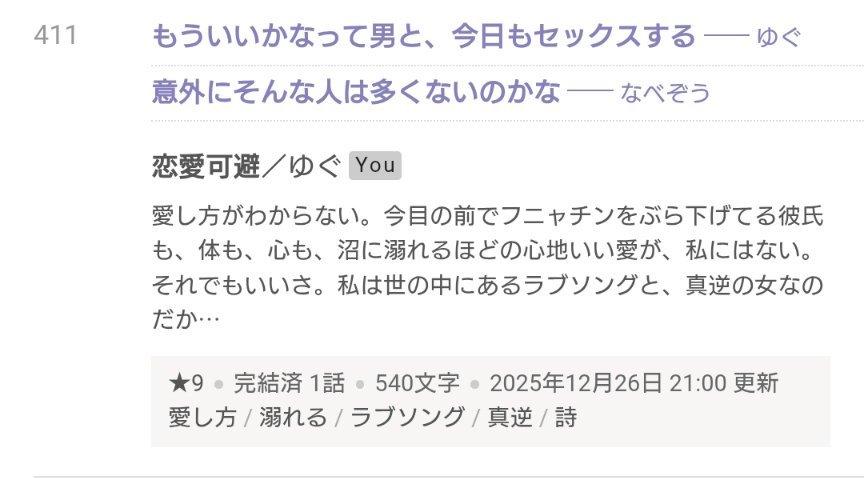 うぉー、ランキング上がってらー。しかも、コメントも来てた。うれしー。体目的で付き合ったときもあったけど、すぐ別れちゃった。