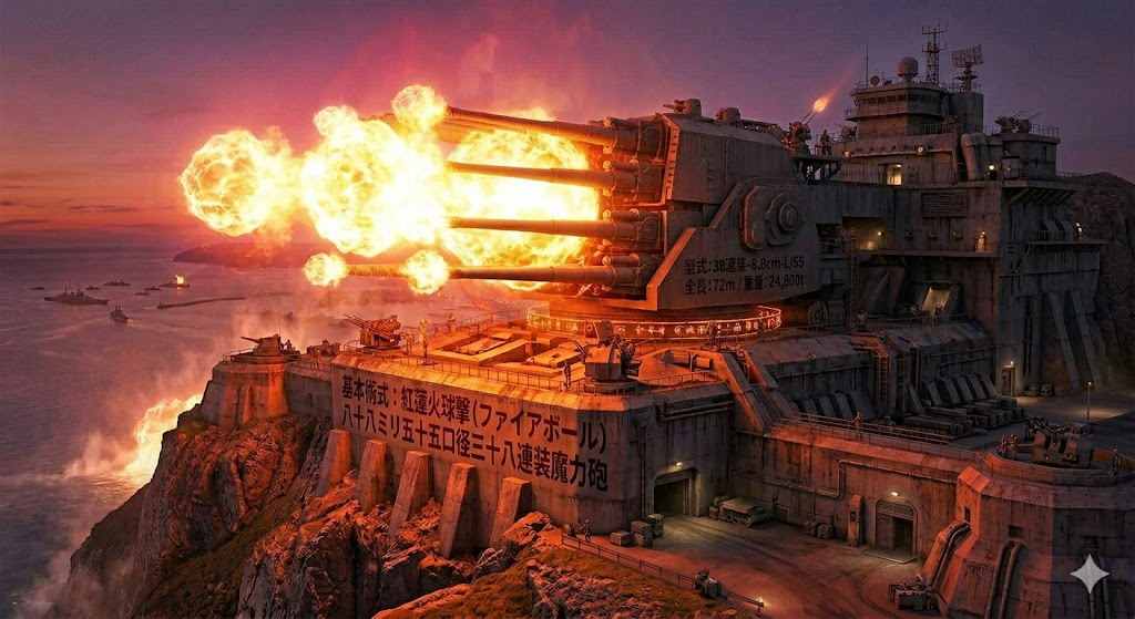執筆中にオーバーヒートしたので、稚作「魔法研究所へようこそ」より、試作八十八ミリ五十五口径魔力三十八連装砲。ファイアボールバージョン。たまに、アホな事考えないと…。