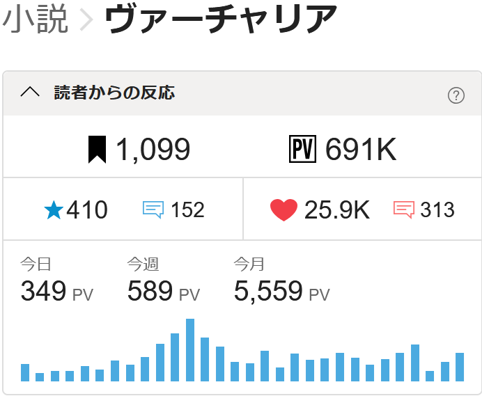 本日、拙著『ヴァーチャリア』の累計PV数が691000PVに到達いたしました。誠にありがとうございます。