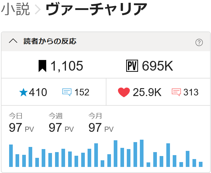 昨夜遅く、拙著『ヴァーチャリア』の累計PV数が695000PVに到達いたしました。誠にありがとうございます。