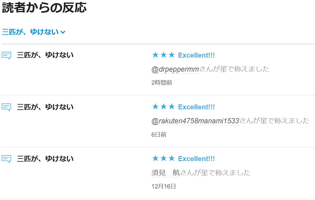 本日、拙著『三匹が、ゆけない』に @drpeppermm 様より★を頂戴いたしました。誠にありがとうございます。