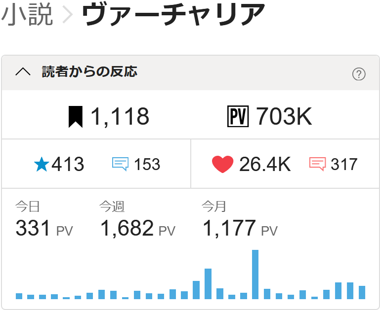 昨夜遅く、拙著『ヴァーチャリア』の累計PV数が703000PVに到達いたしました。誠にありがとうございます。