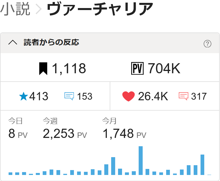 本日未明、拙著『ヴァーチャリア』の累計PV数が704000PVに到達いたしました。誠にありがとうございます。